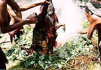 この後、村人たちは仲良く豚君を竹のナイフで切り分けて、塩コショウなんかもちろん無しに、でもほんとうまそうに、食べたのである。もちろん、スポンサーである僕にもぜひ食べろと強力なお誘いがきたが、この先もまだ旅を続けたかったので、丁重に断った。(この項、おわり)