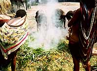 薪を四角く組んでその真ん中にちょっと大きめの石を置いておき、燃え尽きた頃に石を拾い出す。熱くなった石を先の割れた棒でうまくつまんで、男も女も石を運ぶ。運ぶ先は、あらかじめ作っておいた草を積んだ場所だ。