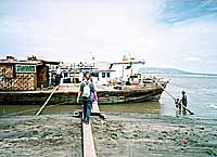マンダレーヒルに昇った翌日はイラワジ川の桟橋からボートに乗ってミングォンという大きなバゴダがある村に向かいました。ガイドブックにはミングォン行きの朝出る定期便があるとあったんですが、聞いてみると無いということでした。近くで白人のツーリストグループが集まって、地元の人となにやら交渉をしていて、数人のグループで船をチャーターしてミングォンに向かうというので、文字どおり、渡りに舟とばかり、私も入れてもらいました。