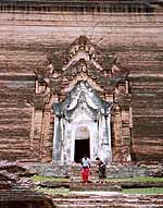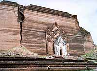 ミングォンに着いて船を下りてしばらく歩くと、れんが色の岩山というか巨大な壁が見えてきます。パゴダというよりやっぱ、「岩山」という表現がいいような気がしますが、よくこんなもん作ったもんだ、というくらい巨大なパゴダでした。まあ、パゴダと言っても巨大壁の中央部がくり抜いてあって、その内部にブッダ像があるだけなんですが、その壁の巨大さには圧倒されます。巨大壁の左右は、古くなったのか、ずいぶん崩れていて、その崩れたところに沿って手すりが(右側)取りつけてあって、現地の人たちが昇ったりしてましたが、すでに昼近くになっていて例によっての暑さのため、昇ることは断念しました。(ホントは高いところに昇るのは大好きなんですけどね)