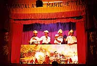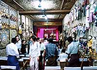 劇場の全景です。劇場といっても、それほど広くなく、学校の教室ぐらいの広さでした。客は、白人のツアー客がほとんどで、あとはぽつぽつと日本人が来てました。マンダレーがミャンマー第二の都市といっても、夜は街路は暗くて、ほかに行くところもないし、必然、マリオネットショーを見に来るということでしょうか。