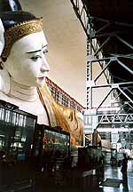 この涅槃はシュエダゴンパゴダではなく、近くのチャウッタヂーパゴダ(ほんと、パゴダの名前は難しい)のものです。大きすぎて、正面から写真を撮ると一部しか見えないので、こんなアングルになってます。ガイドブックによると全長70mもあるそうで、ですがそれを包む建物は工事現場にあるような金属の足場が組んであったりして、お寺というより博物館風でした。