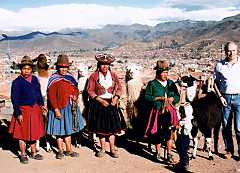 この写真は、バックにクスコの盆地が見える眺めのいい場所にツアーバスが止まっての記念撮影なのですが、こうやってインディヘナおばちゃん達の写真を撮ると少しですがお金を求められます。まあ、わざわざ、リャマをつれてきて向こうも商売のつもり出来てるのでしょうがないですね。