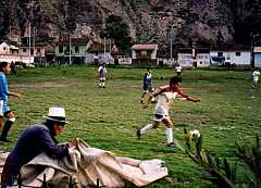 想い出の、サッカー見物お客みんなでバスを押してエンジンをかけようとしましたが、無駄で、クスコから迎えのバスを待つことになり、その間、近くの運動場でサッカーをやってたので、ぼーっと見てました。やっぱ南米ですね。盛んなようですが、ユニフォームなんてバラバラで人数は各チーム数人ぐらい、大人と子供が一緒に混じっていて、ずいぶんいい加減なようですが、それでもみんな楽しそうでした。グランドの端では、おじさんが布を広げて豆を干してたりするところがさすがペルーですね。