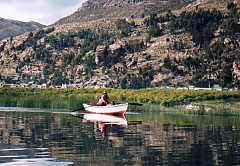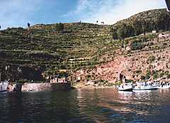 チチカカ湖は琵琶湖の12倍の面積があるそうなんで、湖の中には人が住んでいる島がいくつかあります。このような島は、外界との接触機会が少なく、ということは昔ながらの生活を営む人たちが住んでいて、それは観光客を引きつけるものがある、という訳なのです。世界的な観光スポットでもあり、チチカカ湖に浮かぶ島々をめぐるツアーは、たくさんの地元旅行社から出ており、わたしも前日の晩ツアーをに探してすぐ見つかりました。