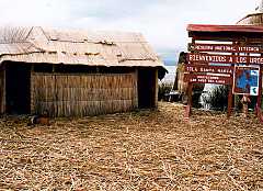ウロス島はアシの葉で作られた浮島です。下の写真はウロス島に住むインディヘナのおばさんですが、地面に藁のようなものが見えますね。これ、アシの葉なのです。中央の広場を囲むように、同じくアシの葉で組み上げられた小屋が数件建ってまして、島の大きき差は15m四方ぐらいでしょうか。