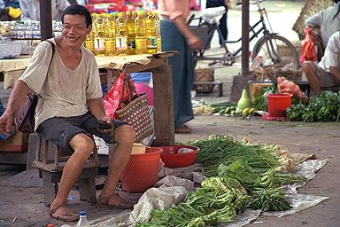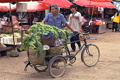 市場といえば、やっぱ、食べ物ですね。そしてここは中国、色々と売られておりました。えー、これは長ネギですね。売ってるおじさんよりも、運んできたおじさんの自転車姿に感動してしまいました。