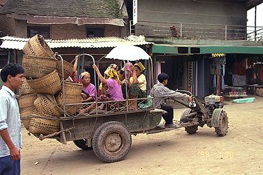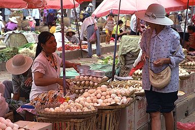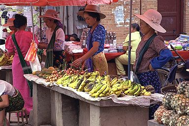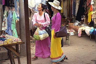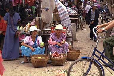 西双版納の中心地・景洪からミニバスで1時間半ほど、モウカイというタイ族で有名な街へ行きました。朝早く行くと市場の盛り上がりが見られる、とガイドブックにはあったのですが、朝弱いもので、9時過ぎにバスに乗ってついたのは11時近かったです。それでも、市場はまだやっていて、行き交うタイ族の女性たち、それから美しい民族衣装を見るとことが出来ました。原色に近い派手な色使いなのですが、これがまた、南国気分を感じさせてくれます。