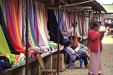 美しい民族衣装は、こんな風な生地屋さんが売っています。色とりどりでして、こんなお店がズラーっと並んでいるのは、壮観でした。どこの国でも一緒ですが、服を買いに来た女の人ってホントに真剣ですねぇ。