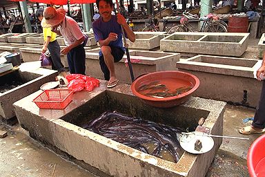 そして、でました、ナマズです。コンクリでできた生け簀というには水の少ない水槽に、ナマズがぎゅーぎゅーに詰めて入れらていて、お客さんが来るとその場でさばいてくれます。とお店のおじさんは、「一匹、どう?」っていう風に言ったのかもしれませんが、中国語のわからない私は買わなかったです。