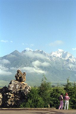 雲南省の南の西双版納の暑さにだいぶ疲れたなーという訳ではありませんが、次の予定の町、雲南省の北に位置する麗江(LiJiang)に飛行機を使って向かいました。麗江は標高が2500m程もあって、山の気候で、昼間は日射しが強く暑いのにからっとして、朝夕は冷え込みます。そして、この麗江近郊には有名な(とは言っても行くまで私は知りませんでしたが)玉龍雪山がそびえているのです。