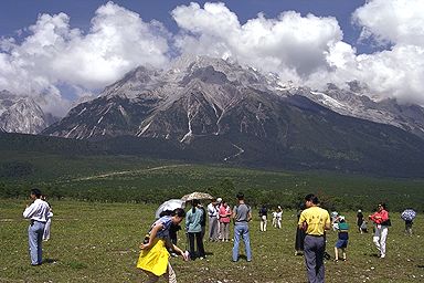 マイクロバスで麗江市街を出て北上し、玉龍雪山の麓の高原で休憩をしつつ、遠くに望む山々を観賞しました。この高原の地点で標高は3000m程、玉龍雪山の最高部で5500mにもなるそうです。