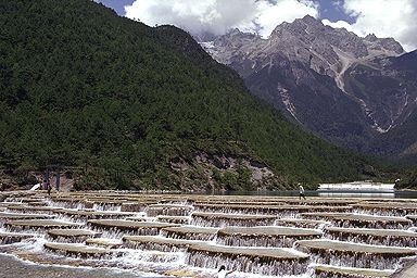 白いのは石灰の堆積でしょうが、日本ではこんなのは無いですね(誰か知ってますか?。トルコのパムッカレがちょうどこんな感じですがあそこは温泉付きだし)