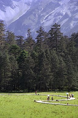 杉の間の道を抜けると広い高原に出ました。ここでは馬が走ってたり(ロバだったかも?)、お土産屋が並んでたり、それから雲南の民族衣装を着て写真を撮るコーナーがあったり、大にぎわいでした。でもやはり、そんなものよりも、より間近になった玉龍雪山と近景の杉の美しさが一番でしょう。高原の遊歩道を歩く間、何度も雄大な山を眺め、しばし歩くのをやめてゆっくりと景色を楽しみました。