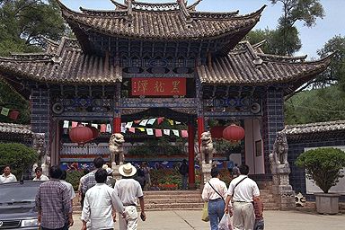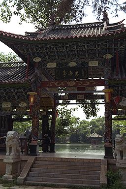 麗江の街の北はずれには、玉泉公園というところがありまして、ここも中国人観光客で賑わっておりました。 美しい池と楼閣、水辺に映る山々、と行きたかったのですが、あいにくの曇り空でして、玉龍雪山はこのときは見えませんでした。 四方街を歩き疲れたその足で、街の北のはずれまで歩いて、ほんとは公園で休憩するつもりが、ずいぶん広い公園で、くたくたになりました。